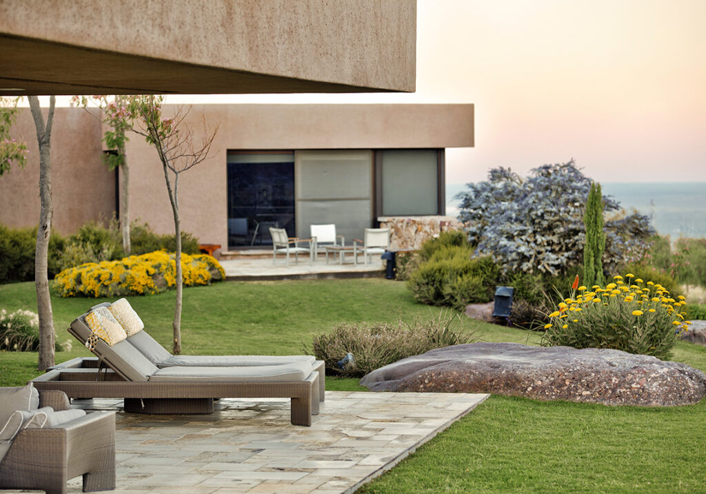 El diseño evita la rigidez. Las masas vegetales se organizan en franjas y bordes que acompañan las líneas de la arquitectura, pero sin caer en la literalidad. Las rocas, el césped contenido y los planos abiertos generan una transición gradual entre lo construido y el paisaje lejano.